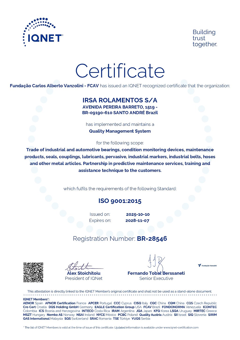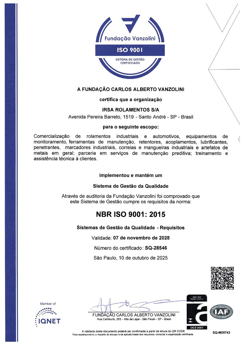 A IRSA Rolamentos , distribuidora autorizada das marcas SKF, PTI, BGL e FRM oferece mais de 15 mil produtos de manutenção industrial com pronta entrega. Contamos com uma equipe experiente e altamente especializada, dedicada a oferecer soluções personalizadas e eficientes. Nos orgulhamos de ser seu parceiro confiável para atender todas as suas necessidades industriais.