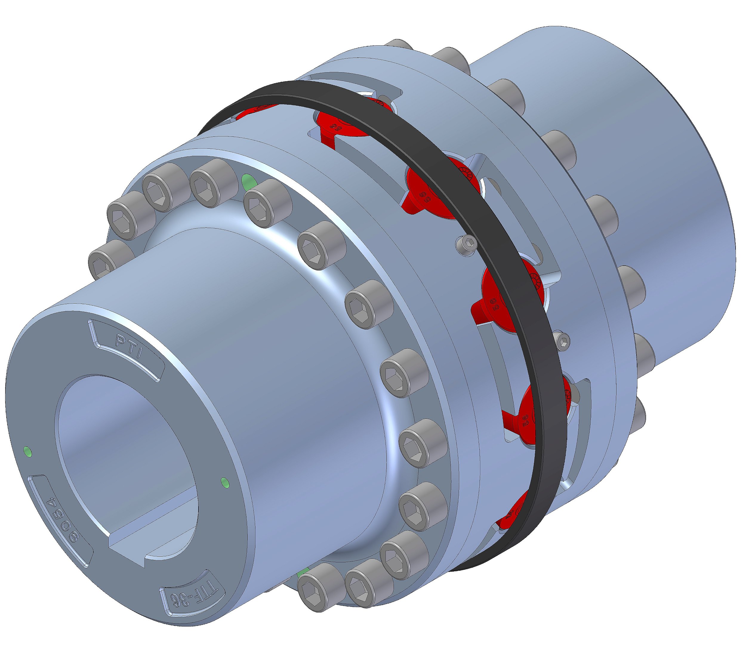 O acoplamento TTXL-M é composto por um cubo padrão com garras, um cubo adicional, um flange com garras e vários elementos elásticos dispostos radialmente entre as garras. Indicado onde existe um pequeno afastamento entre as pontas dos eixos. Permite a desmontagem radial de uma ou ambas máquinas acopladas. Permite trocar os elementos elásticos sem deslocá-las, bem como o acionamento independente da máquina acionada ou acionadora. Permite o giro independente de um dos eixos se necessário.